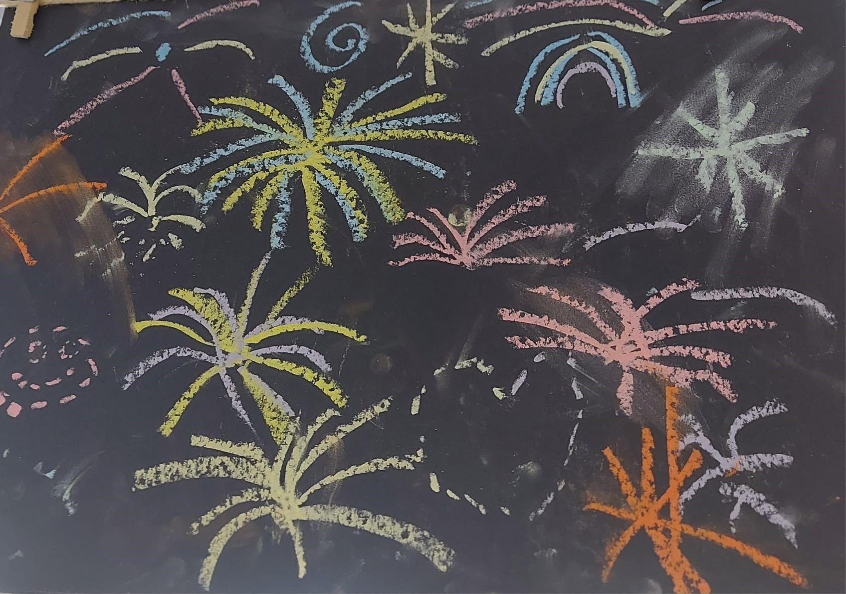 Die Äffchen haben zur Feuerwerksmusik von Händel mit Kreide tolle Feuerwerksbilder gestaltet. Hier eine kleine Auswahl.