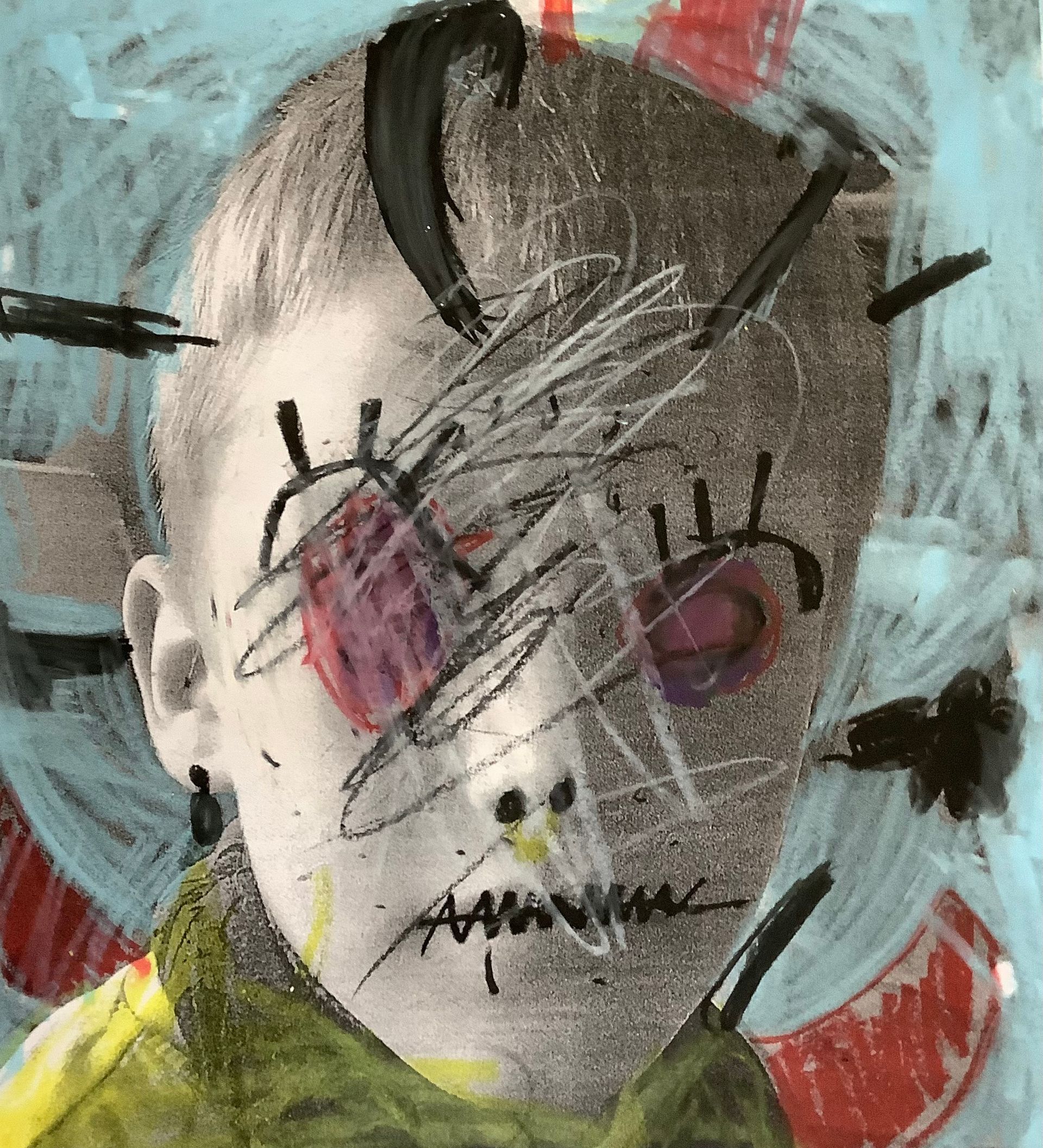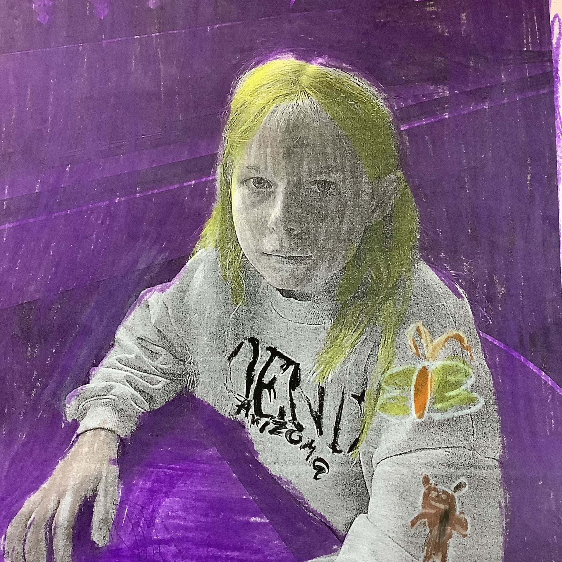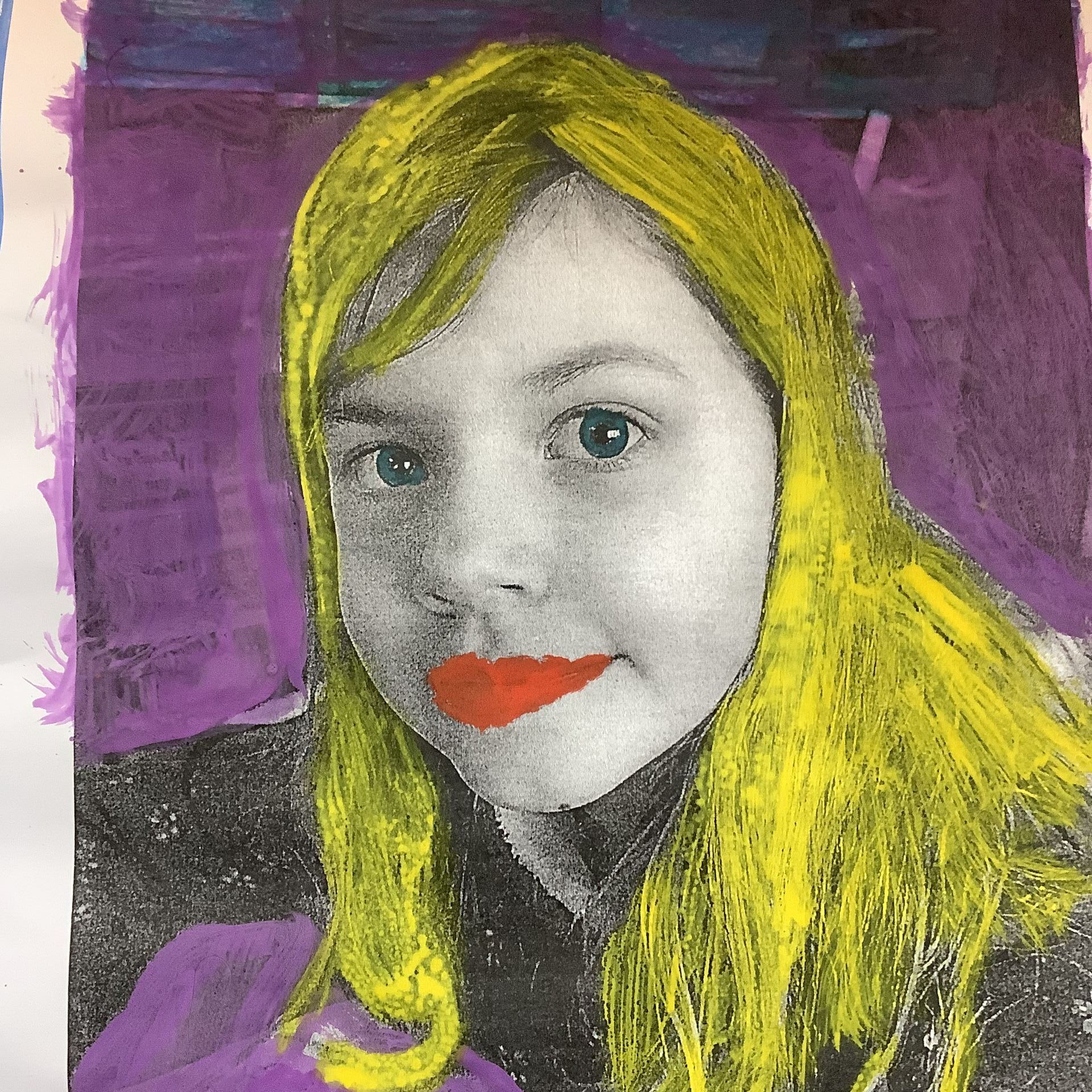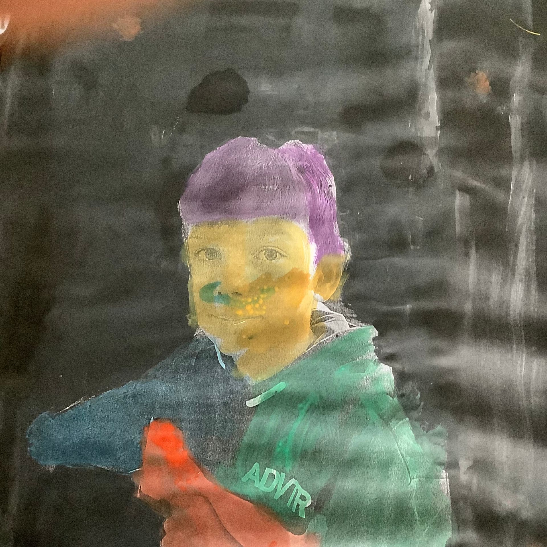 Die Kinder nahmen das Bild des Malers zum Anlass, um eigene Porträtfotos zu übermalen. Aufgabe war es, dabei ihr Verhältnis zur Kunst zum Ausdruck zu bringen. Dabei sind lustige, bunte und wilde Selbstporträts entstanden, die zum Nachdenken anregen.