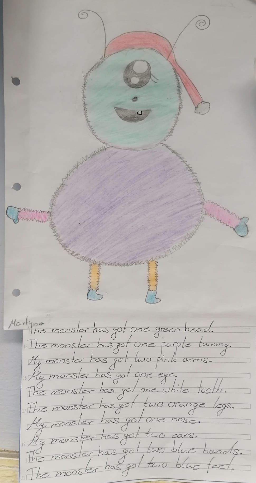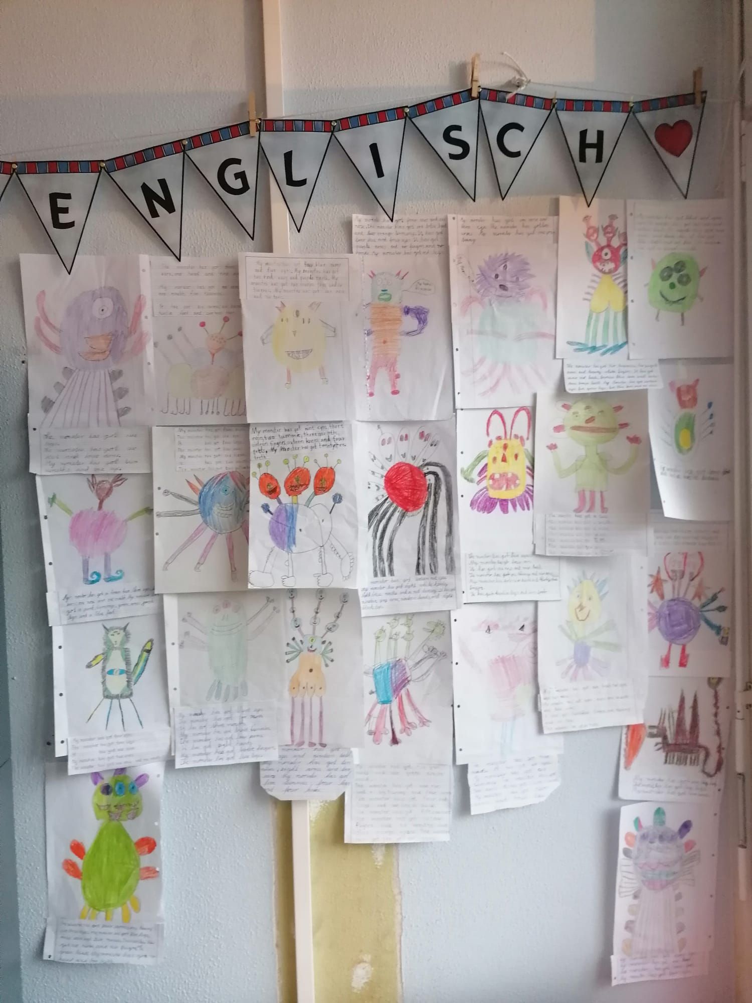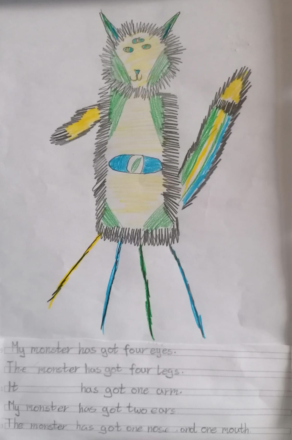 Im Englischunterricht der 3. Klassen ging es zuletzt um das Thema ‘body’. Im Rahmen dieser Unterrichtsreihe lernten die Kinder Monster mit drei Köpfen, vier Armen, sieben Füßen... kennen. Im Anschluss malten die SchülerInnen ihre eigenen, freundlichen Monster und fertigten Beschreibungen dazu an. Auf diese Beschreibungen können die Kinder besonders stolz sein. Denn diese sind einige ihrer ersten schriftlichen Texte, die die DrittklässlerInnen auf Englisch verfasst haben.